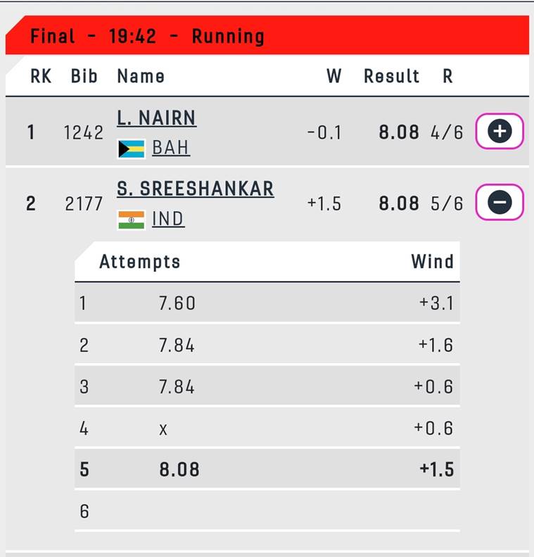 FYI: So both Sreeshankar and Nairn recorded 8.08m but Nairn is first because he recorded the distance in an earlier jump and had a less favorable wind conditions (-0.1). Sreeshankar's jump had a wind assistance of +1.5. Sreeshankar now needs a 7.94 or better on his final jump to go into the lead