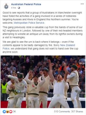 As the holder of the Ashes, Australia only needed to draw the series to keep cricket’s famous urn. The AFP tagged London’s Metropolitan Police Service and New Zealand police, saying an English gang ‘stole a valuable cup’ from the hands of Kiwis in the summer and they are happy to see that the activities of this gang have been foiled and the ‘urn is back where it belongs’.