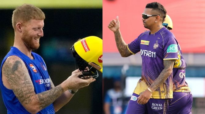 Ben Stokes (left) during a practice session and Sunil Narine celebrates after taking a wicket. (PTI | Twitter/IPL)