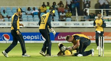 The incident took place in the 14th over, after Russell, batting on zero, failed to connect with a pull. Zouks pacer Hardus Viljoen had bowled a short ball, and the ball struck Russell’s helmet near the right ear.