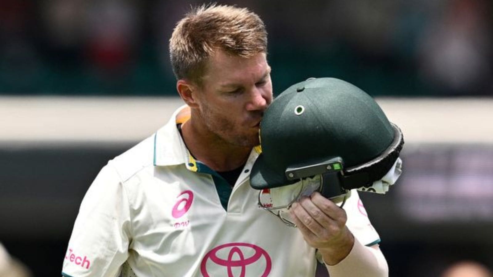 Australia's David Warner kisses the coat of arms on his helmet as he leaves the field in his last test match after being dismissed off the bowling of Pakistan's Sajid Khan. (Reuters)