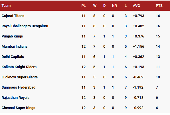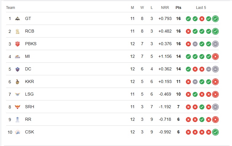 Gujarat Titans and Royal Challengers Bengaluru both sit with 16 points in 11 matches and hold the first and second positions respectively. Punjab Kings are third, followed by Mumbai Indians and Delhi Capitals. Chennai Super Kings, Rajasthan Roylas and Sunrisers Hyderabad are officially out of playoffs contention while Kolkata Knight Riders are practically out too. Although they still have mathematical (negligible) chances.