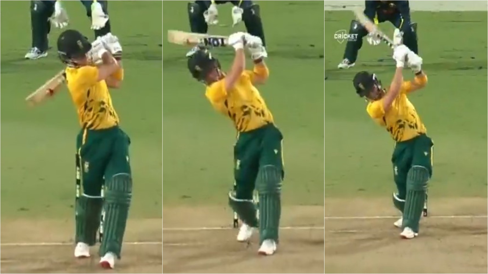What really caught the eye in the third match was Brevis’ ability to slam his trademark ‘no look sixes’. And he did it not once, not twice but thrice against the hosts in back to back deliveries. The feat happened in the 10th over of the Proteas innings when Brevis struck Aaron Hardie’s 3rd delivery over deep midwicket and onto the roof.