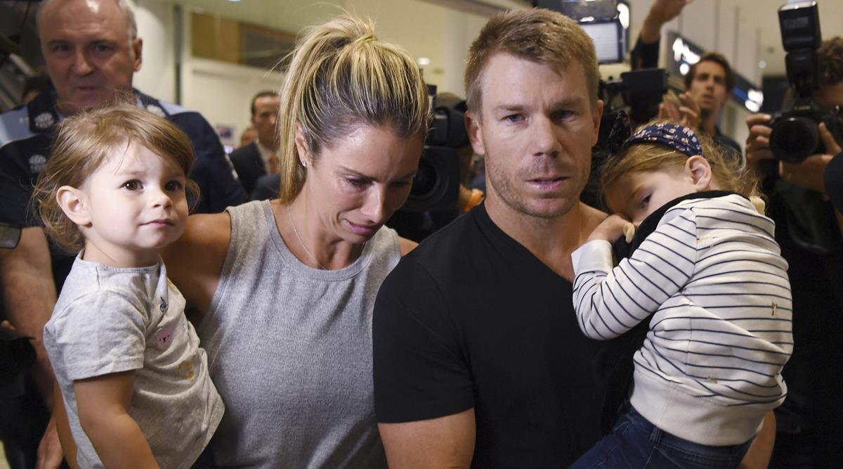 Disgraced Australian Cricket Vice Captain David Warner, second right, at the arrival with wife Candice, second left, and their children at Sydney Airport. (Source: AP)