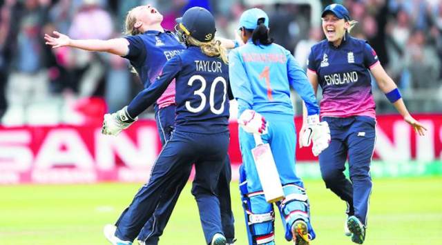 Anya Shrubsole celebrates after taking the last Indian wicket, that of Rajeshwari Gayakwad, to seal England’s triumph in the Women’s World Cup final at Lord’s on Sunday. (Source: Reuters)