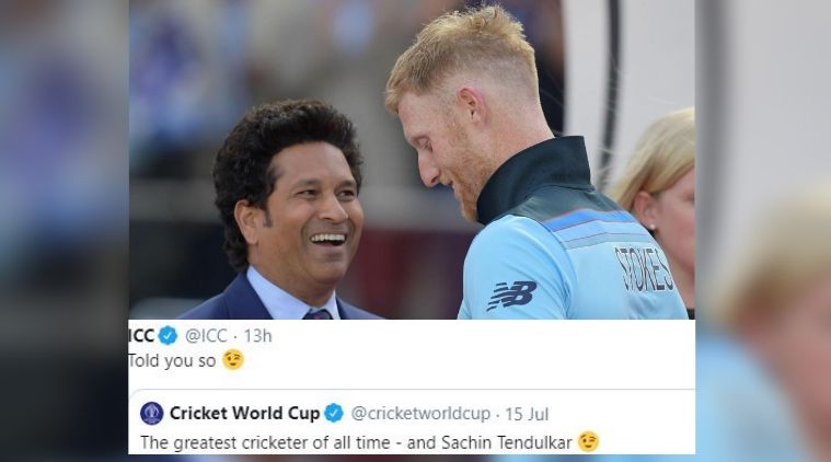 In its tweet after the World Cup final, the ICC handle tweeted a picture of Stokes with Tendulkar at the award ceremony and tweeted it with the caption: “The greatest cricketer of all time – and Sachin Tendulkar.” There was even a winking emoji, but the tweet did not go down well with Tendulkar fans.