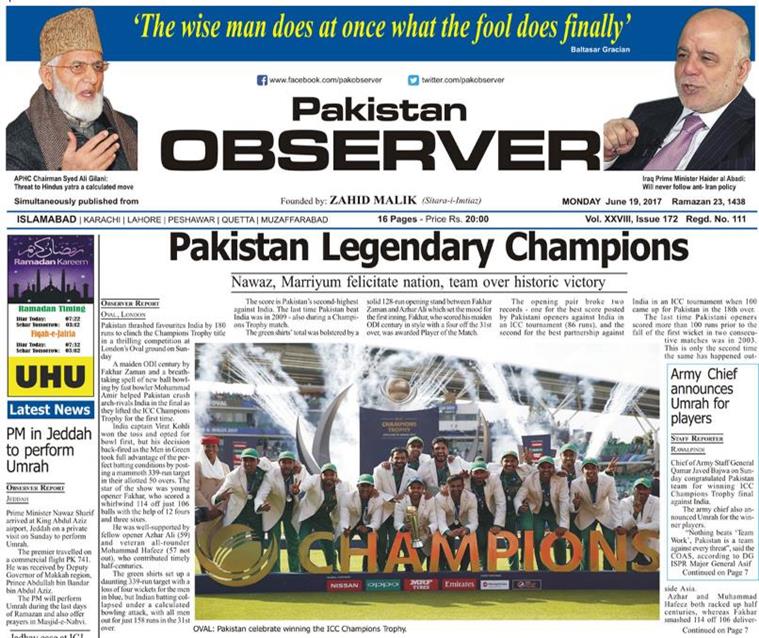 Pakistan Observer, which began publishing in 1988, in their unique style lauded the champions. Their headline read, “Pakistan Legendary Champions”. They carried quotes by PM Nawaz Sharif, Minister Marriyum Aurangzeb as they congratulated the team.