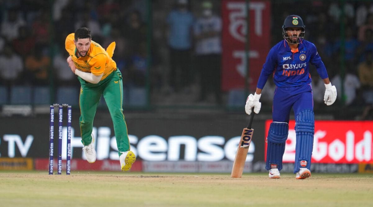 South Africa's Wayne Parnell, left, bowls a delivery during the first Twenty20 cricket match between India and South Africa in New Delhi, India, Thursday, June 9, 2022. (AP Photo/Altaf Qadri)