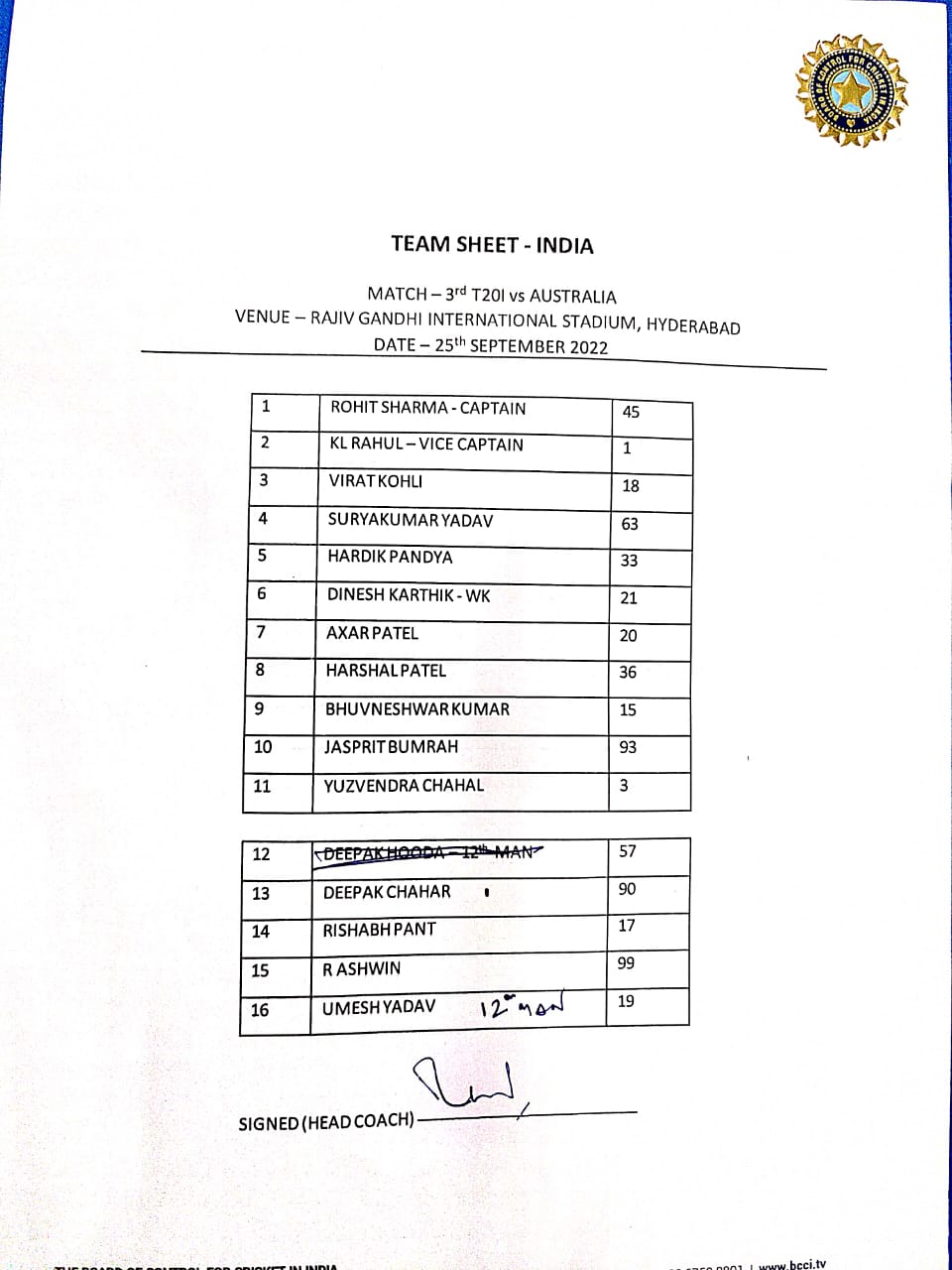 India: Rohit Sharma (c), KL Rahul, Virat Kohli, Suryakumar Yadav, Hardik Pandya, Dinesh Karthik (wk), Axar Patel, Harshal Patel, Bhuvneshwar Kumar, Jasprit Bumrah, Yuzvendra Chahal