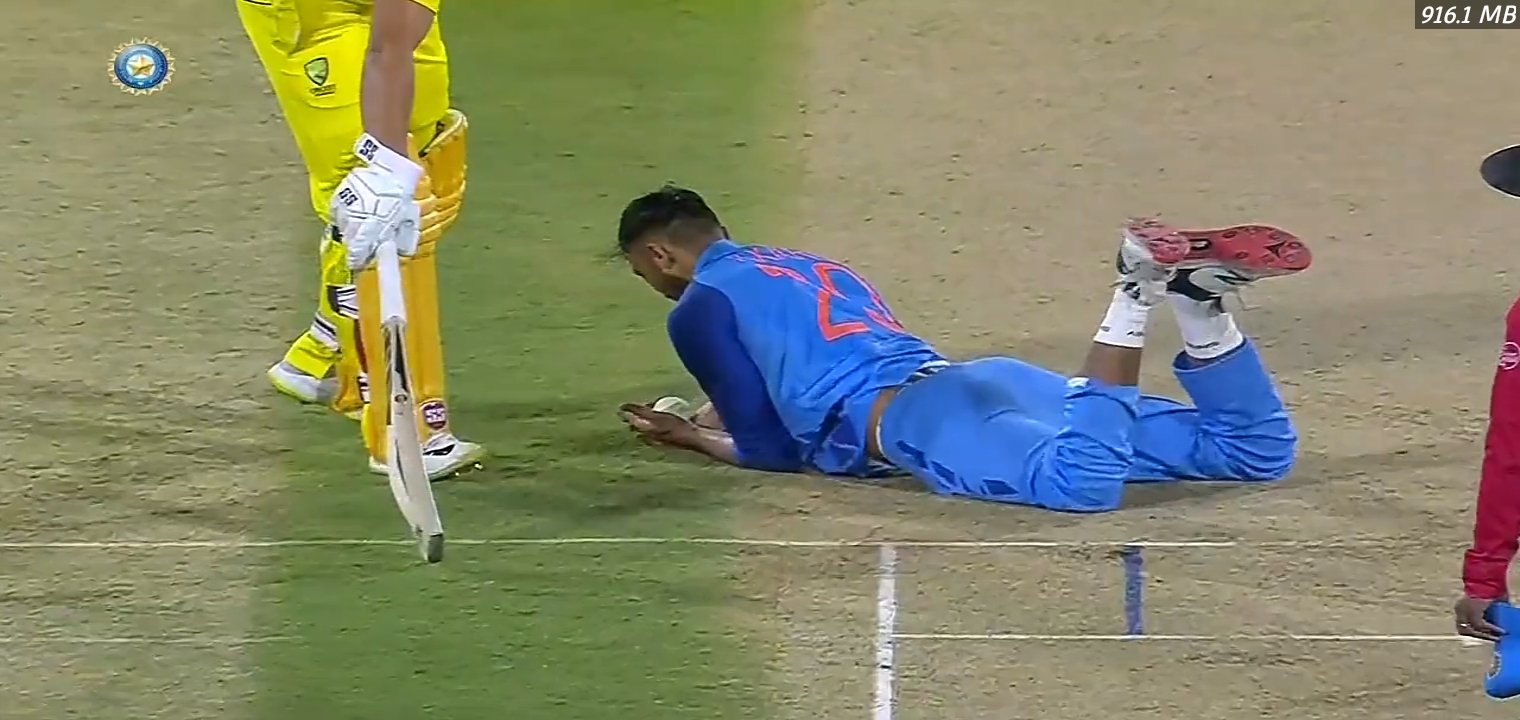 Axar in to bowl the 4th and starts with conceding a 4. The third ball Finch tries to hit, gets it wrong and Hardik is under it to take a simple catch. AUS 44/1 after 3.3 overs