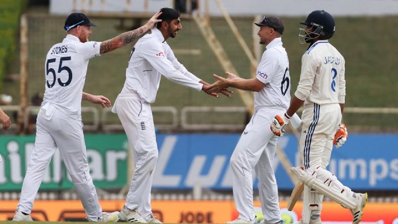 England's Shoaib Bashir celebrates with Joe Root and Ben Stokes after taking the wicket of India's Ravindra Jadeja, caught out by Ollie Pope (Reuters)