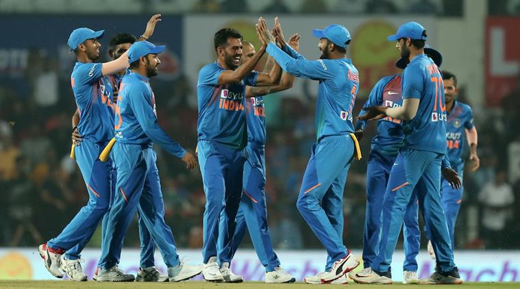 Deepak Chahar is congratulated by India players after the wicket of Mohammad Mithun in the 3rd T20I vs Bangladesh on Sunday. He finished with figures of 6/7. (Photo Source: Twitter/BCCI)