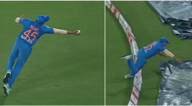Rohit Sharma gets his hand to a ball near the boundary line but cannot hold on to the catch, managing to throw the ball back into the field before taking a tumble over the ropes in the 1st T20I vs West Indies in Hyderabad on Friday.