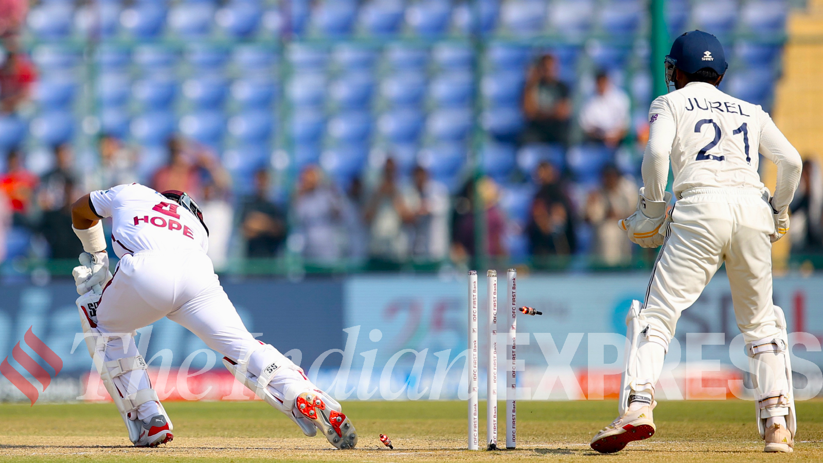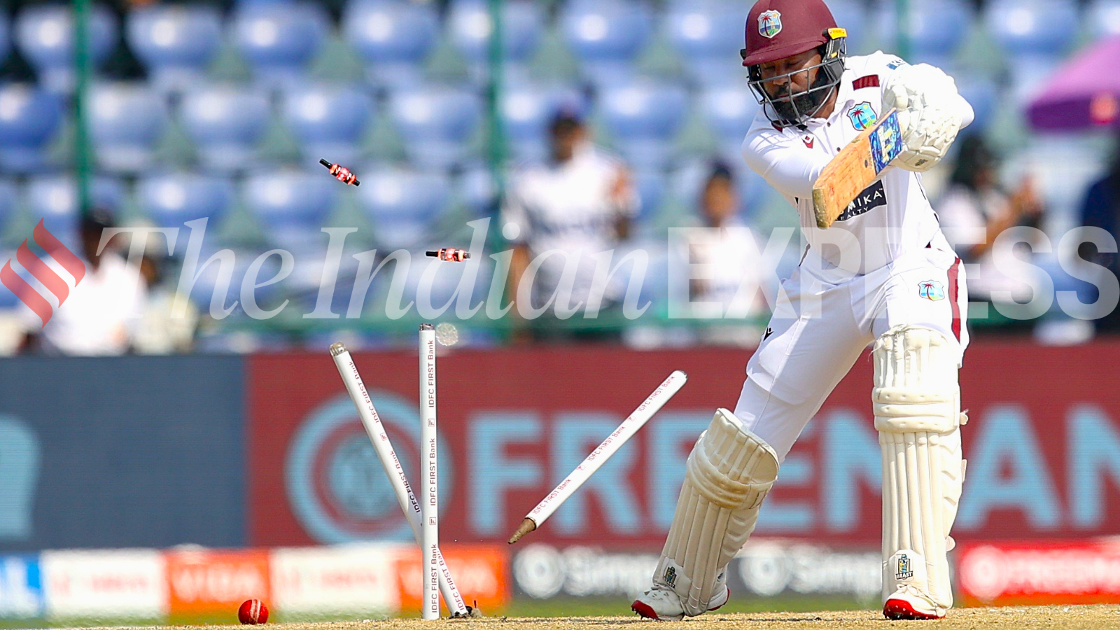 IND vs WI 2nd Test Live Cricket Score India vs West Indies: Alick Athanaze of the West Indies looks at his stumps after being bowled in the second innings just before Tea on day 3. (Express Photo by Praveen Khanna)