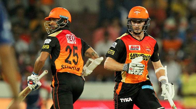 2001 hrs IST: 10 runs came off that first over. Jayant Yadav’s first ball was a no-ball and the resulting free-hit went for four. Five more singles come off that over and it is a brisk start for SRH.