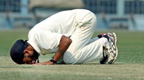 Railways bowler Anureet Singh kissing the pitch after picking 5 wickets of Bengal during Ranji Trophy quarterfinal match at Eden Garden in Kolkata on Saturday. PTI