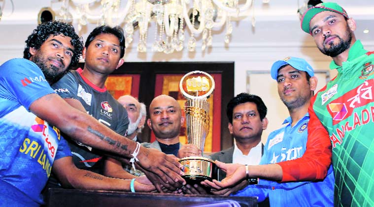 Bangladesh’s Mashrafe Mortaza, India’s MS Dhoni, UAE’s Amjad Javed and Sri Lanka’s Lasith Malinga pose with the Asia Cup trophy in Dhaka on Tuesday. (Source: AP)