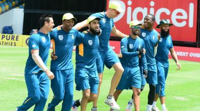 # WICKET! Narine has another. Sixth wicket falls. Morris defends but it goes to short-leg where Pollard stretches to take a good catch. The best part – Pollard runs towards the boundary to celebrate with the crowd