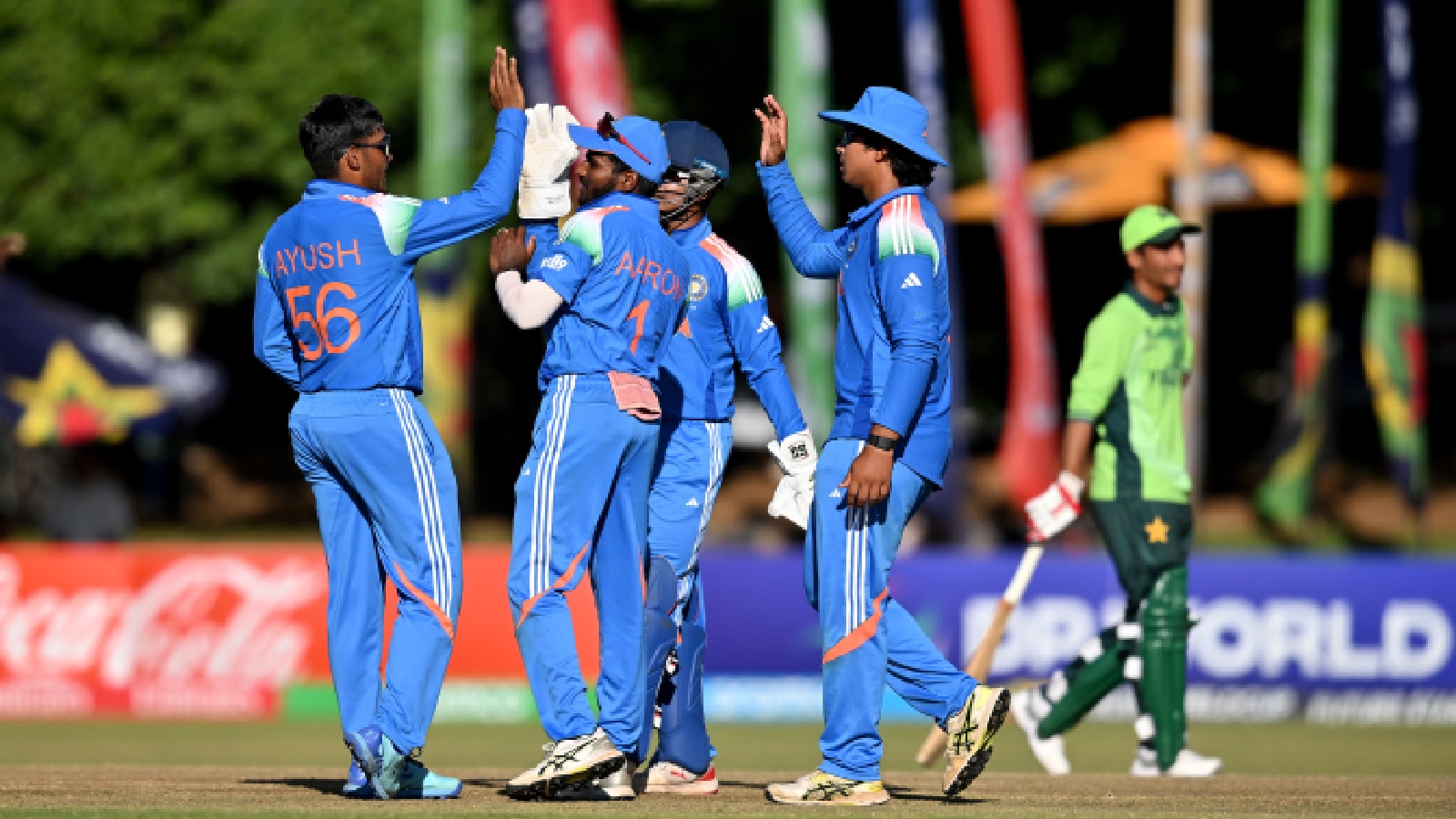 India players celebrate after taking a Pakistan wicket in the U-19 World Cup match. (Credit: ICC)