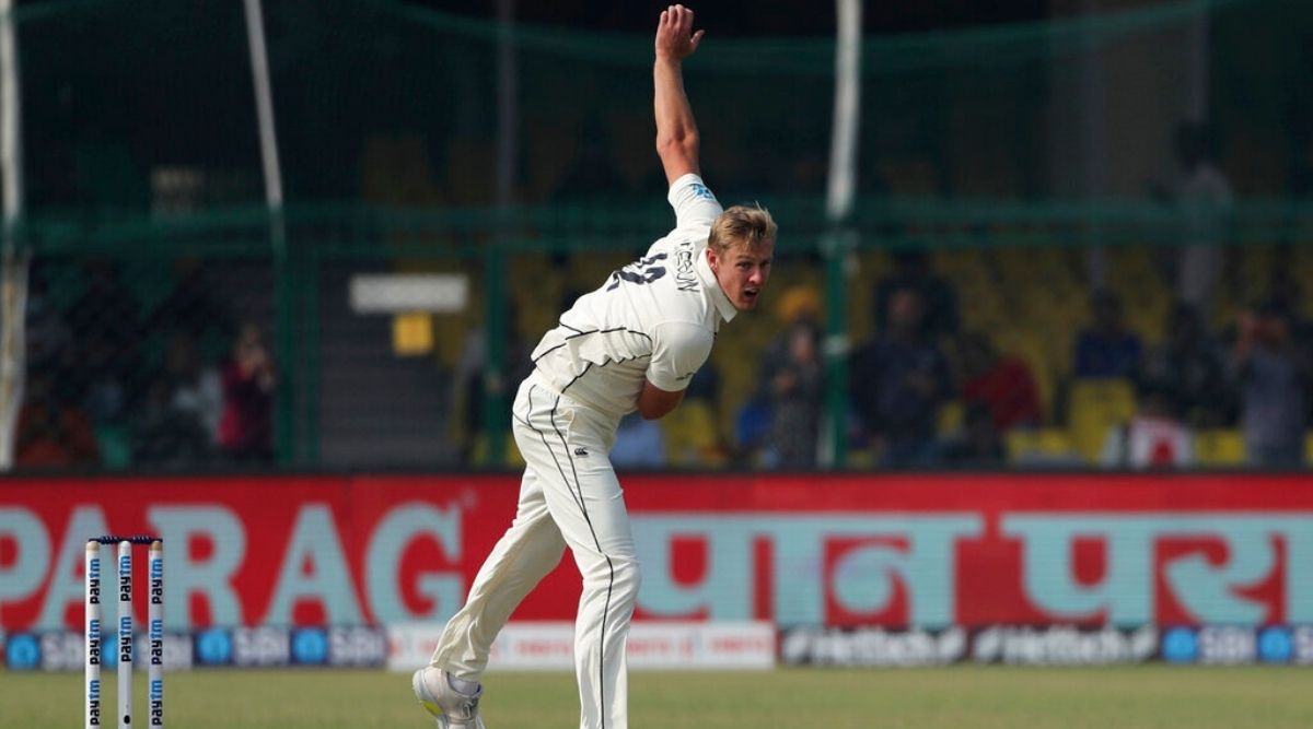 New Zealand's Kyle Jamieson bowls during the day one of their first Test cricket match with India in Kanpur. (AP Photo)
