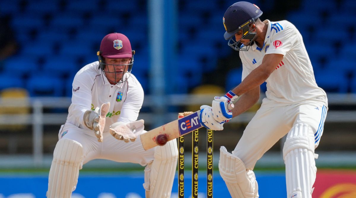Shubman Gill plays a shot against West Indies' Jomel Warrican in the second Test in Port of Spain. (AP Photo)