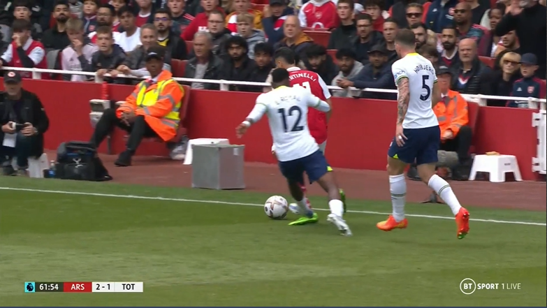 Romero win nsit strongly from Odegaard. Kane with the ball and Emerson Royal stumbles. Richarlison comes back from an offside position. Free kick to the Gunners.