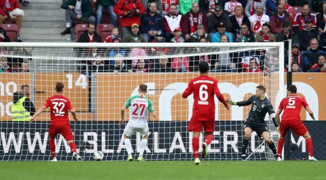 Alfred Finnbogason scored in injury time to earn Augsburg a 2-2 draw with Bayern Munich and prevent the German champion from reclaiming the top spot in the Bundesliga on Saturday. Goals from Robert Lewandowski and Serge Gnabry had put Bayern on course to move a point ahead of Borussia Monchengladbach ahead of its late-game at Borussia Dortmund, but Finnbogason ensured they dropped points for the second consecutive game and remained a point behind the league leaders. The seven-time defending champion was stunned when Augsburg's Marco Richter scored in the first minute after a one-two with Rani Khedira. But Gnabry crossed for Lewandowski to equalize in the 14th. It ensured the Polish striker matched Pierre-Emerick Aubameyang's Bundesliga record of scoring in each of the first eight games of the season. The former Dortmund striker managed it in 2015. Lewandowski also became the first to score in eight consecutive league games for Bayern since Dutch forward Roy Makaay in 2005. Bayern's first-half performance was marred by many small mistakes, though both sides missed good chances to score. Gnabry made no mistake four minutes into the second half with a fine individual goal, but the visitors were stunned again when Sergio Cordova set up Finnbogason's late leveler. There was further bad news for Niko Kovac's team as defender Niklas Sule was forced off early with an injury and left the dressing room on crutches. Bayern began the game with former Germany forward Thomas Muller on the bench for the sixth consecutive game, while midfielder Javi Martinez started for the first time this season. UNION WINS Union Berlin ended a run of four defeats by beating Freiburg 2-0 at home thanks to goals from Marius Bulter and Marcus Ingvartsen. Bulter got the home side off to a flying start when he let fly inside the top right corner in the second minute, while sealed the result with a fine dipping shot under the crossbar in the 84th. Leipzig was held 1-1 at unbeaten Wolfsburg, Hertha Berlin came back to draw 1-1 at Werder Bremen and Fortuna Dusseldorf defeated 10-man Mainz 1-0.