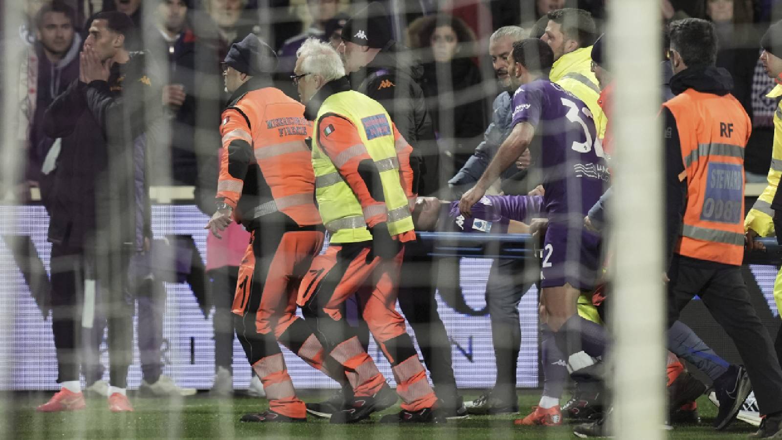 Fiorentina's Edoardo Bove, injured, is transported to a waiting ambulance during the Serie A soccer match between Fiorentina and Inter at the Artemio Franchi Stadium in Florence, Italy, Sunday Dec. 1, 2024 (Massimo Paolone/LaPresse via AP)