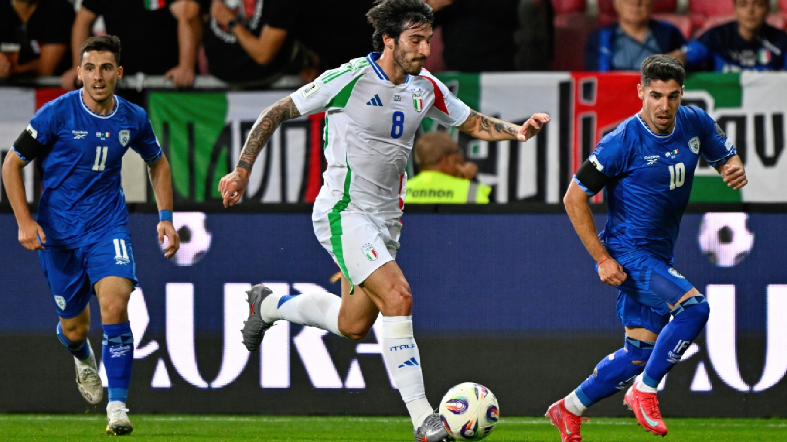 Italy's Sandro Tonali, center, runs with the ball during a Group I, World Cup qualifier soccer match between Israel and Italy at the Nagyerdei Stadium in Debrecen, Hungary, Monday, Sept. 8, 2025. (AP Photo)