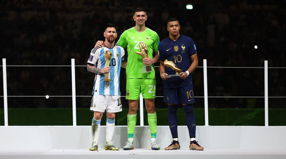 Argentina's Lionel Messi, Argentina's Emiliano Martinez and France's Kylian Mbappe pose after being awarded the Golden Ball, Golden Glove and Golden Boot respectively. (Reuters)