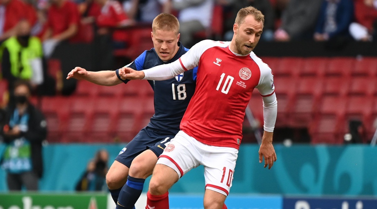 Denmark's Christian Eriksen in action with Finland's Jere Uronen (Source: Reuters)