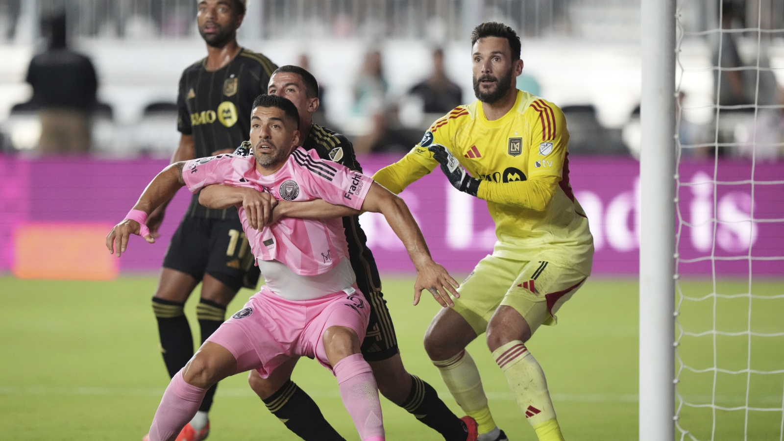 Inter Miami forward Luis Suárez (9) battles for position with Los Angeles FC Sergi Palencia (14) and goalkeeper Hugo Lloris (1) during the CONCACAF Nations League Quarterfinal Match. (AP)