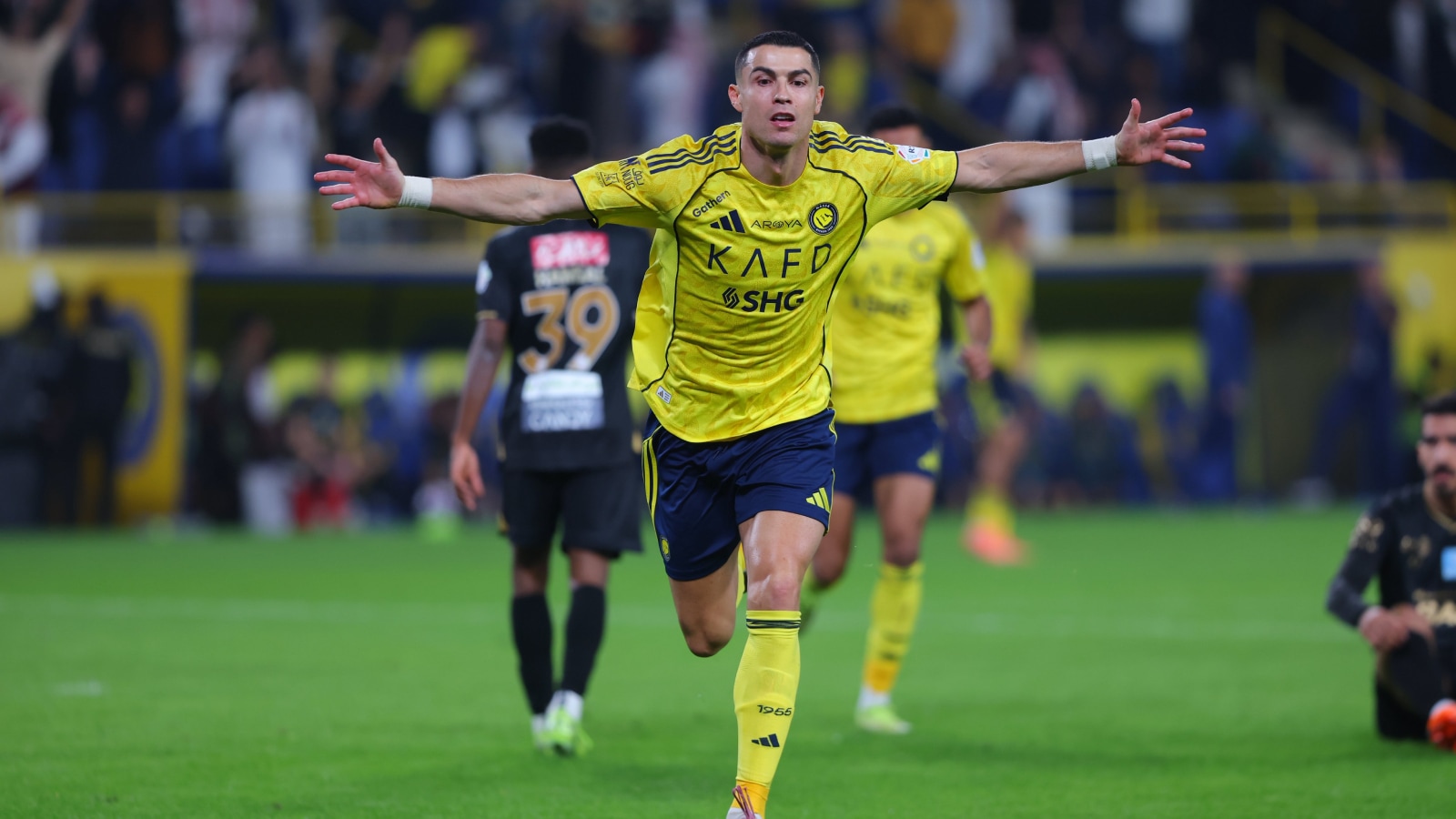 Cristiano Ronaldo celebrates his goal for Al Nassr against Al Khaleej in Saudi Pro League game. (X/Al Nassr)