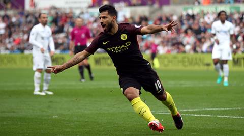 Manchester City’s Sergio Aguero scored two goals in his sides 3-1 victory against Swansea City away from home in the Premier League. (AP Photo)