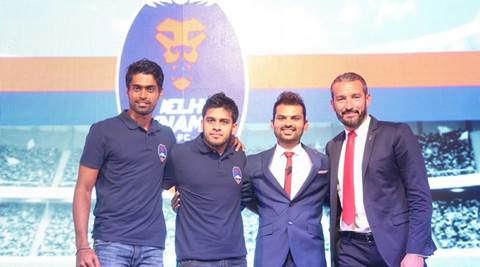 Gianluca Zambrotta (extreme right) at his unveiling as Delhi Dynamos manager.