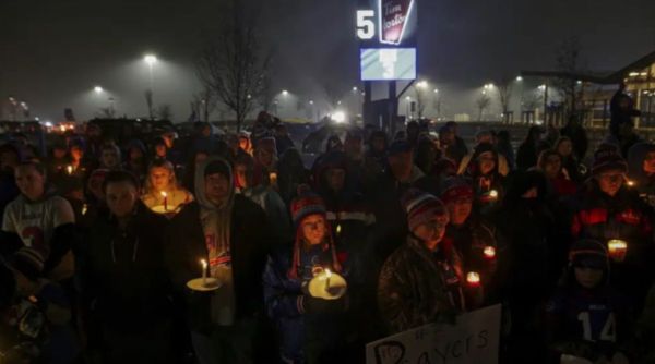 Buffalo Bills fans and community members gather for a candlelight vigil for Buffalo Bills safety Damar Hamlin on Tuesday, Jan. 3, 2023, in Orchard Park, N.Y. (AP)
