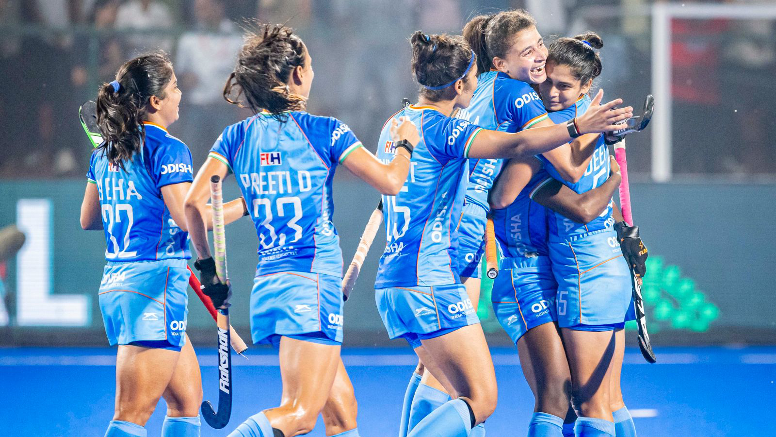 Deepika (R) celebrates with her teammates. (Hockey India)