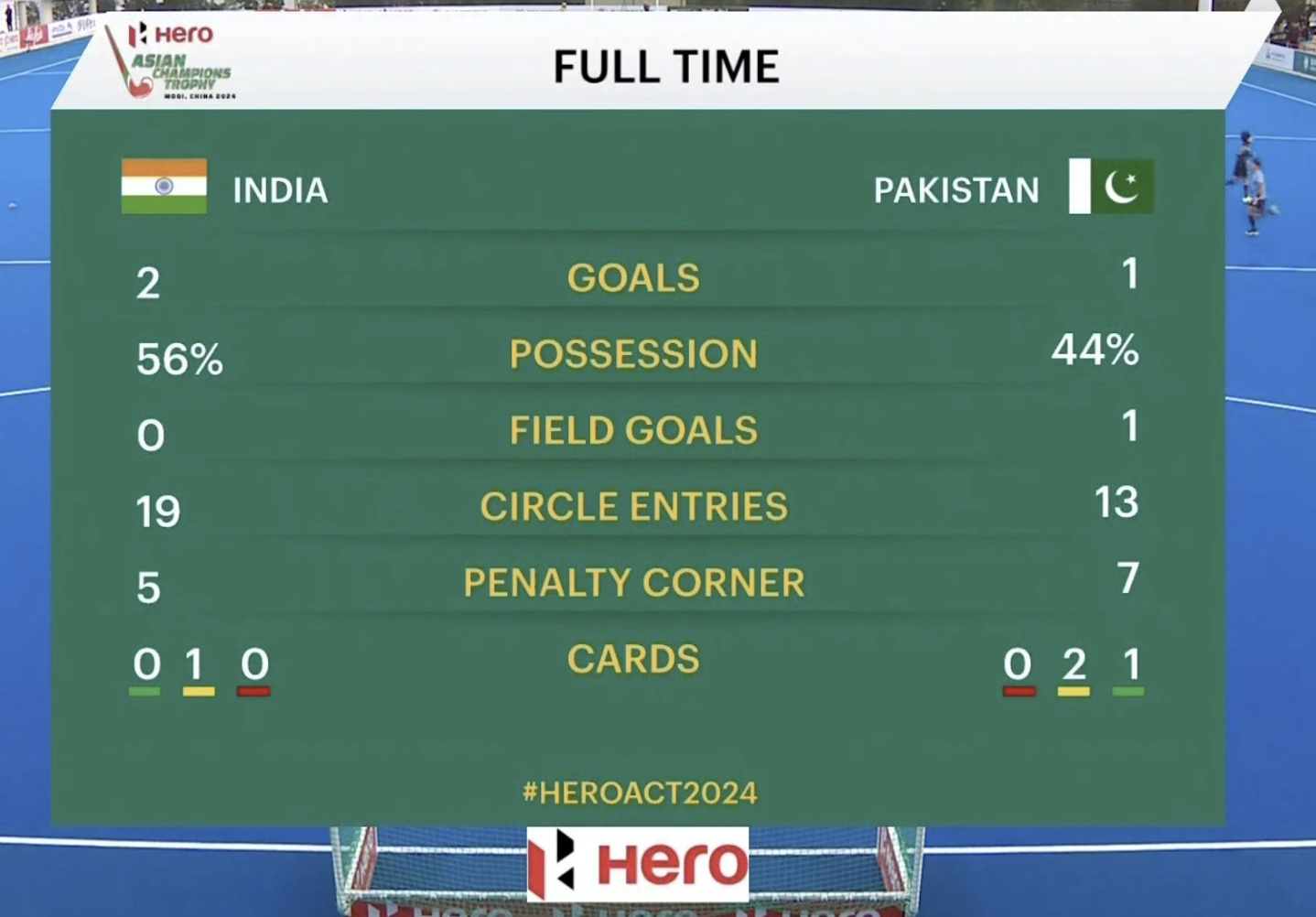 India start the final quarter with a circle entry driven by Sukhjeet but Abhishek's reverse hit is eventually too high. Pakistan are now back to their full strength as Sufyan's suspension ends.