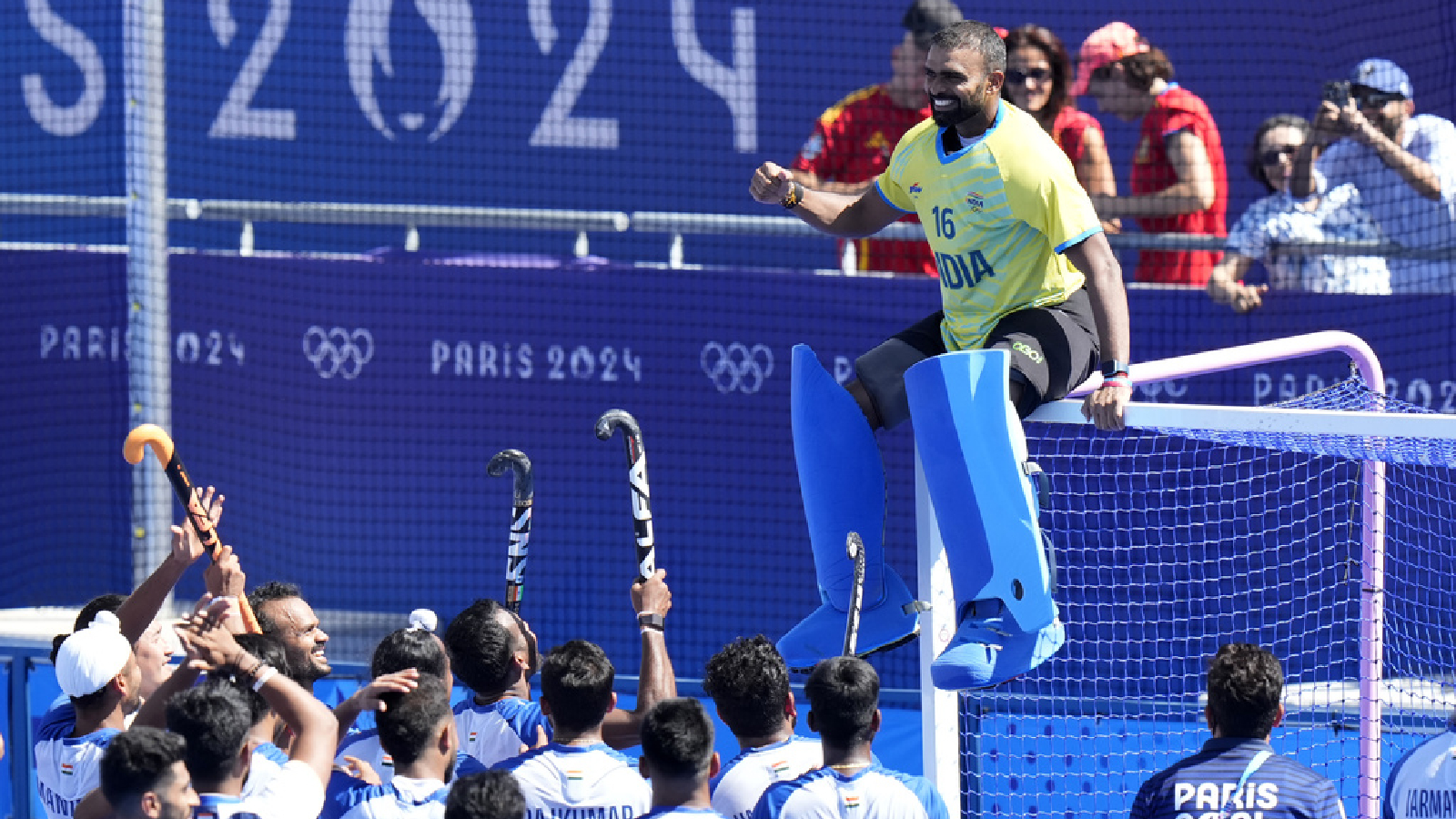 India's goalkeeper Parattu Reveendran Sreejesh, in yellow jersey, sits on the goal cross-bars as India's players celebrate after winning the men's bronze medal field hockey match against Spain at the Yves-du-Manoir Stadium during the 2024 Summer Olympics, Thursday, Aug. 8, 2024, in Colombes, France. (AP Photo/Aijaz Rahi)