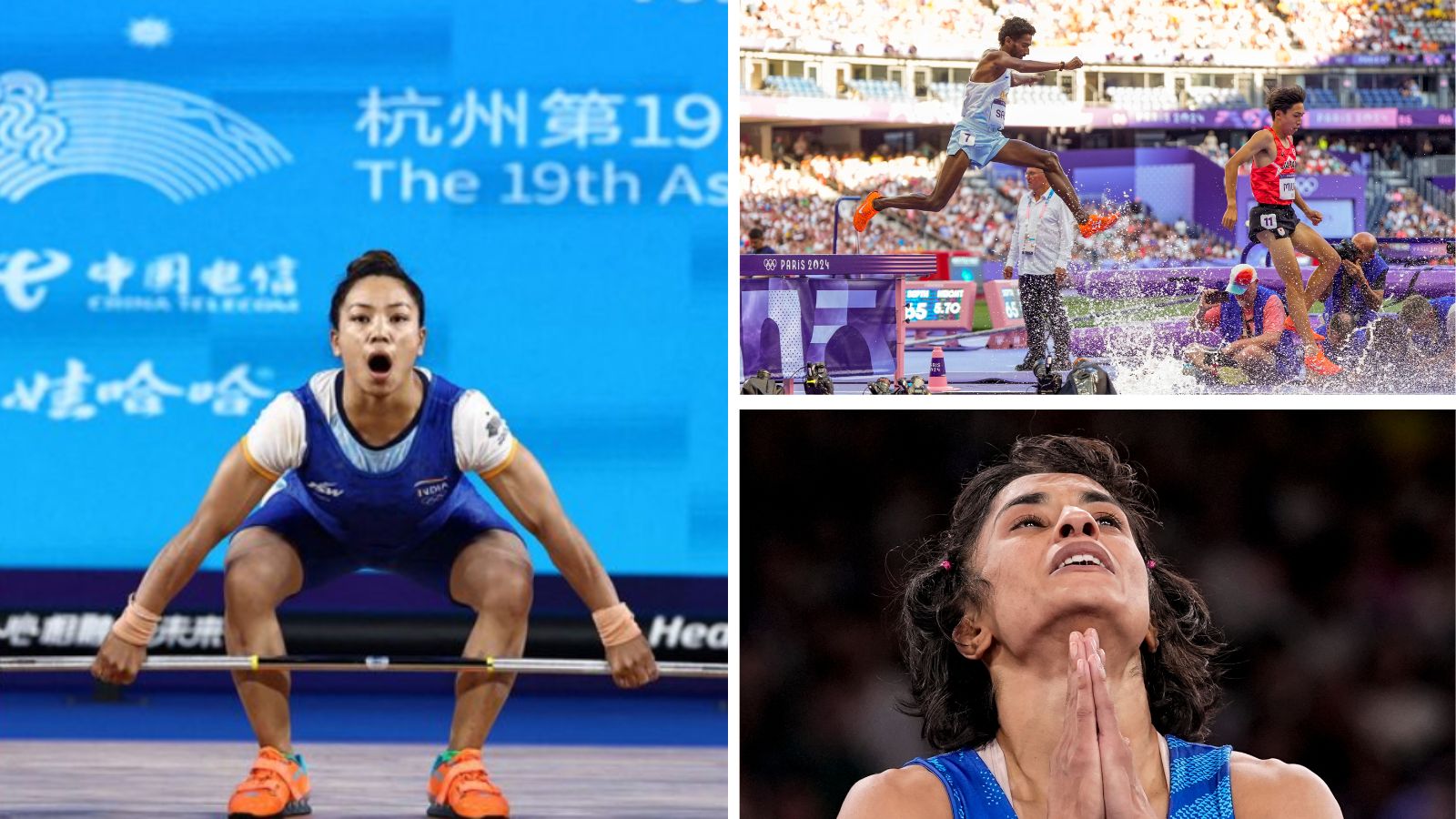 (Clockwise) Mirabai Chanu, Avinash Sable and Vinesh Phogat will all feature on Day 12 at Paris 2024. (Reuters/PTI)
