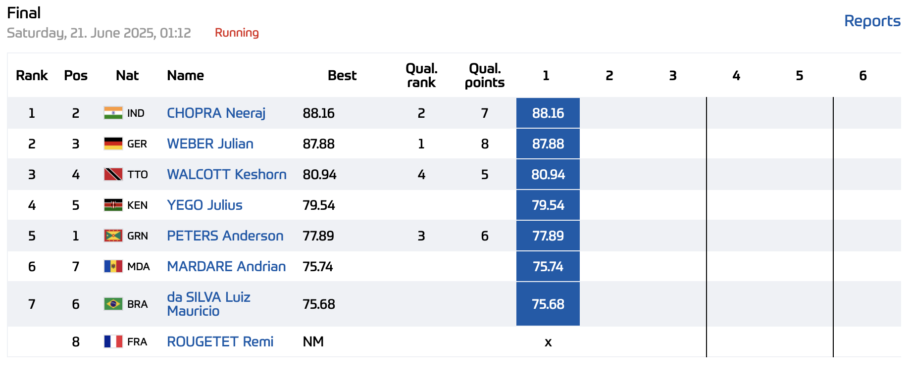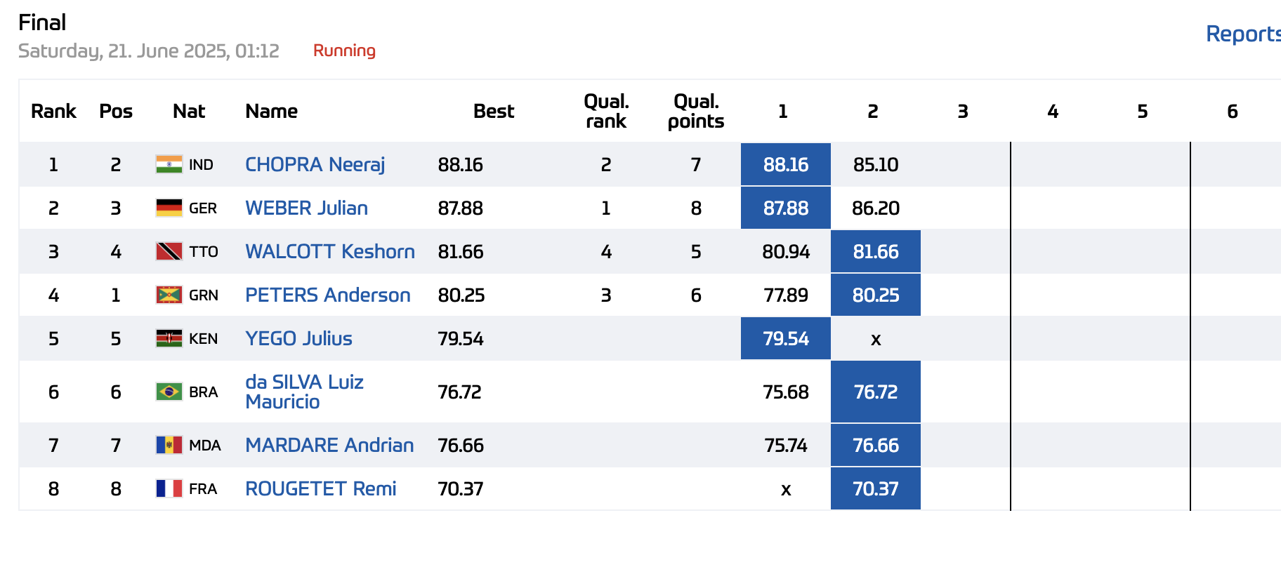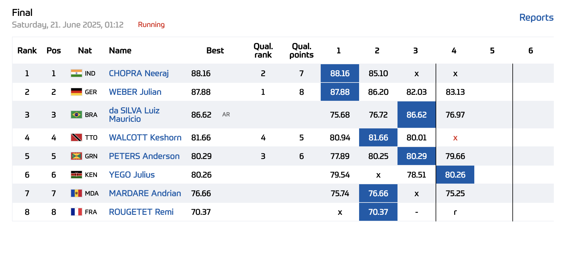 The top three have been confirmed and it is Chopra ahead of Weber ahead of Da Silva. As it happens in DL meets, the order will be Chopra, Weber, Da Silva for the 6th attempt. Will Weber pull off another heist?