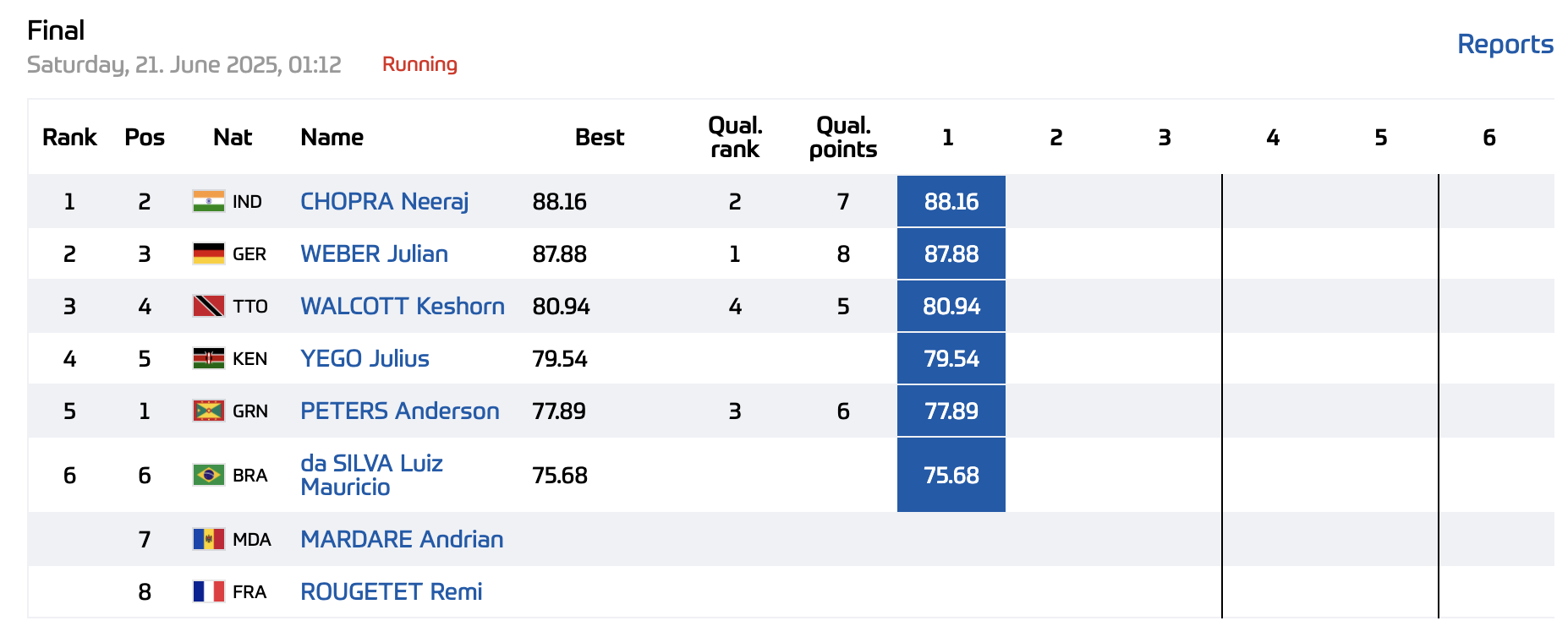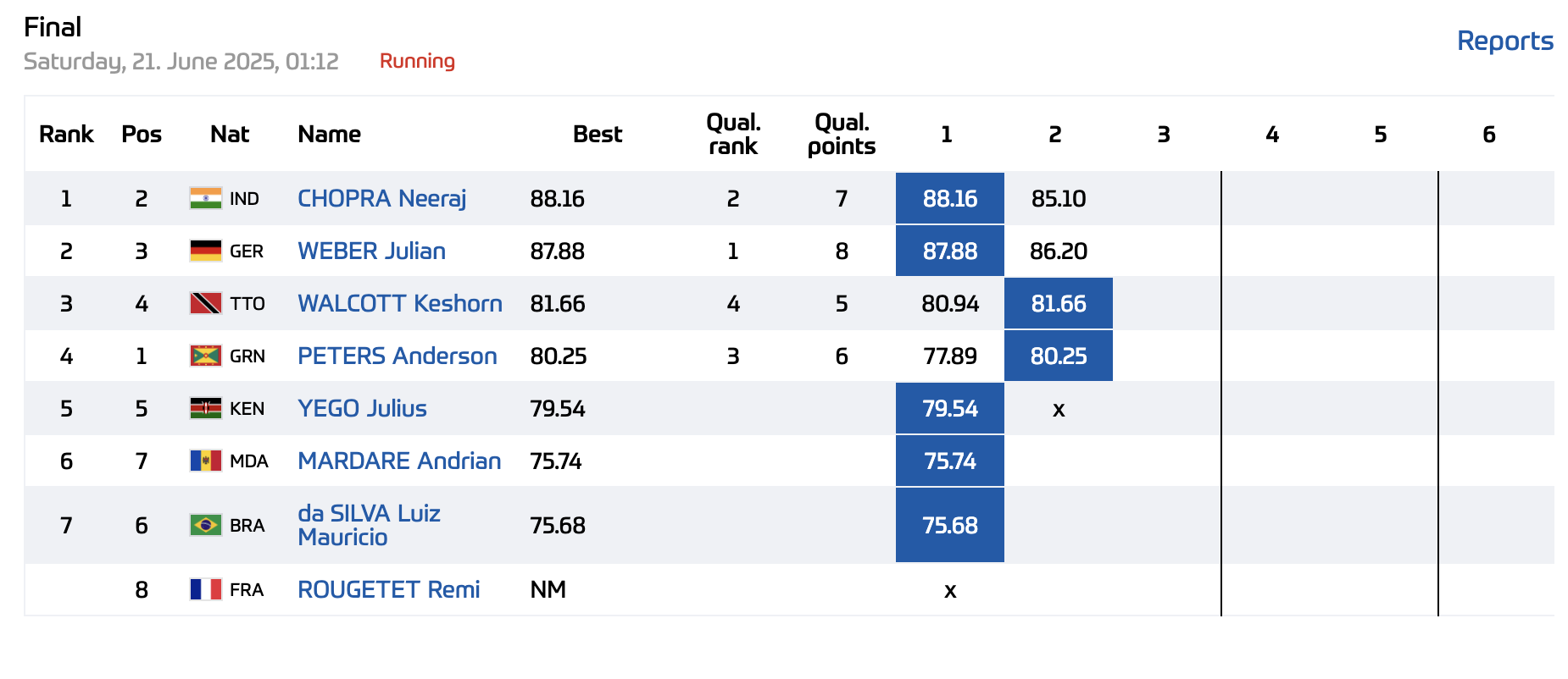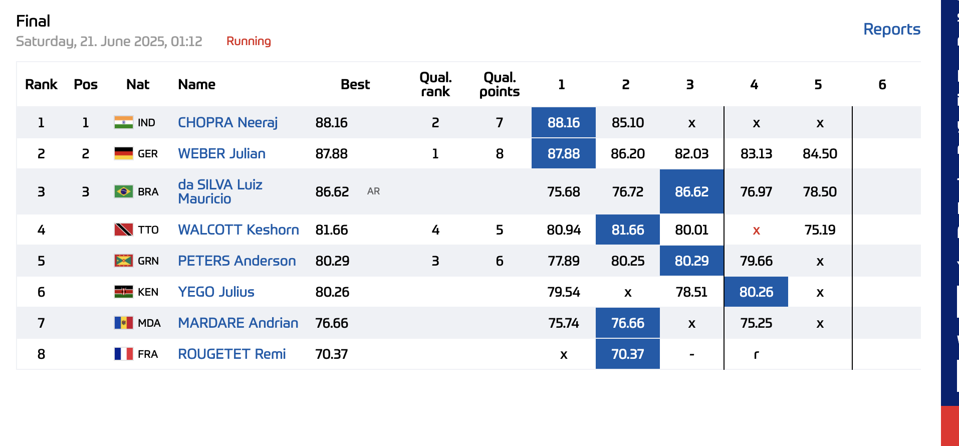 The top three have been confirmed and it is Chopra ahead of Weber ahead of Da Silva. As it happens in DL meets, the order will be Chopra, Weber, Da Silva for the 6th attempt. Will Weber pull off another heist?