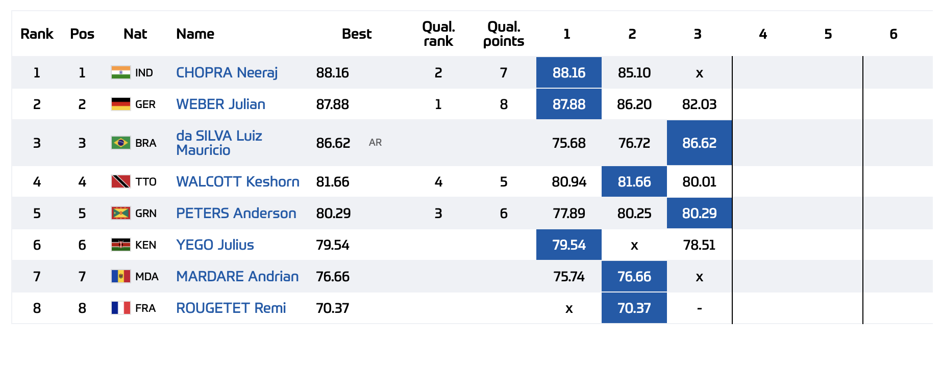 Four attempts done, there is no change to the top three with Peters still outside the bracket. Neeraj, Weber and Da Silva. One more throw for the rest of the field to try and sneak into the top three otherwise we will have these three men competing for the final sixth throw.