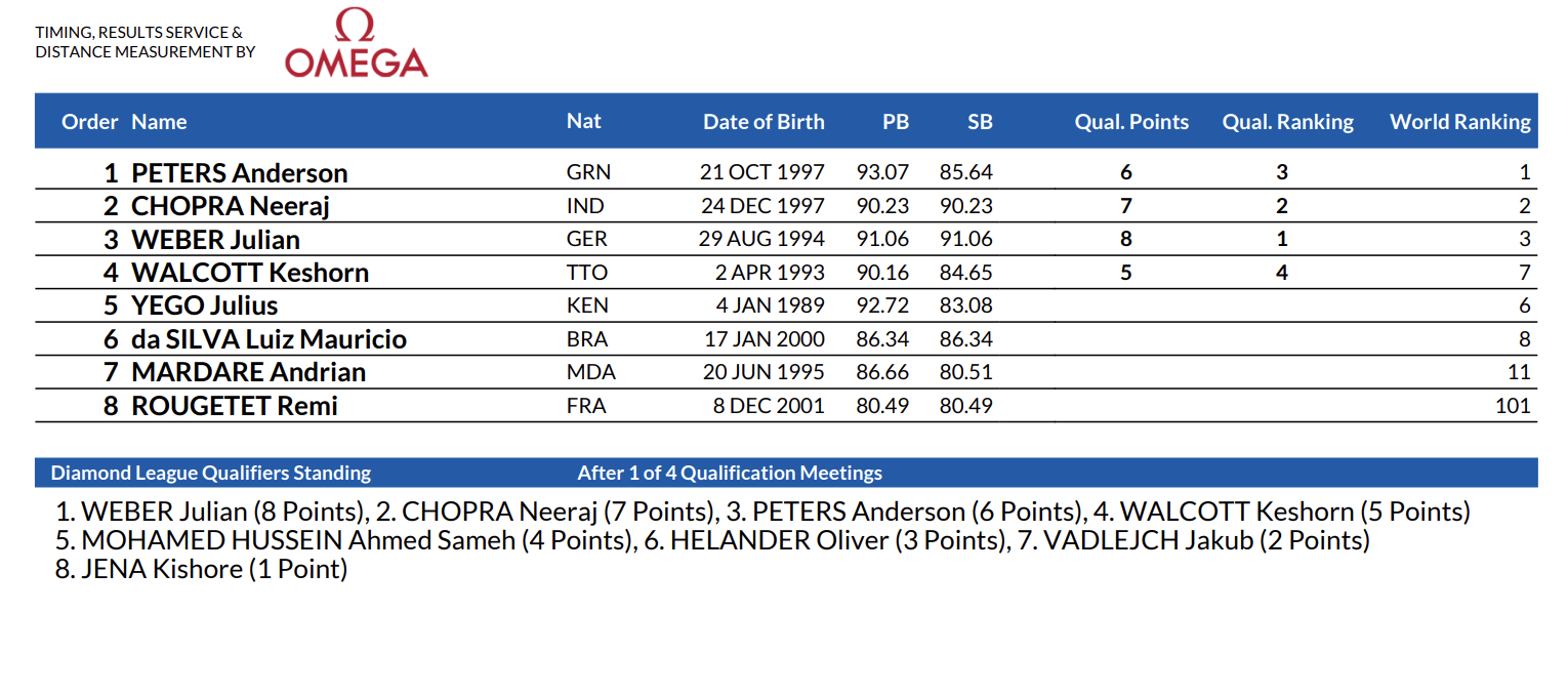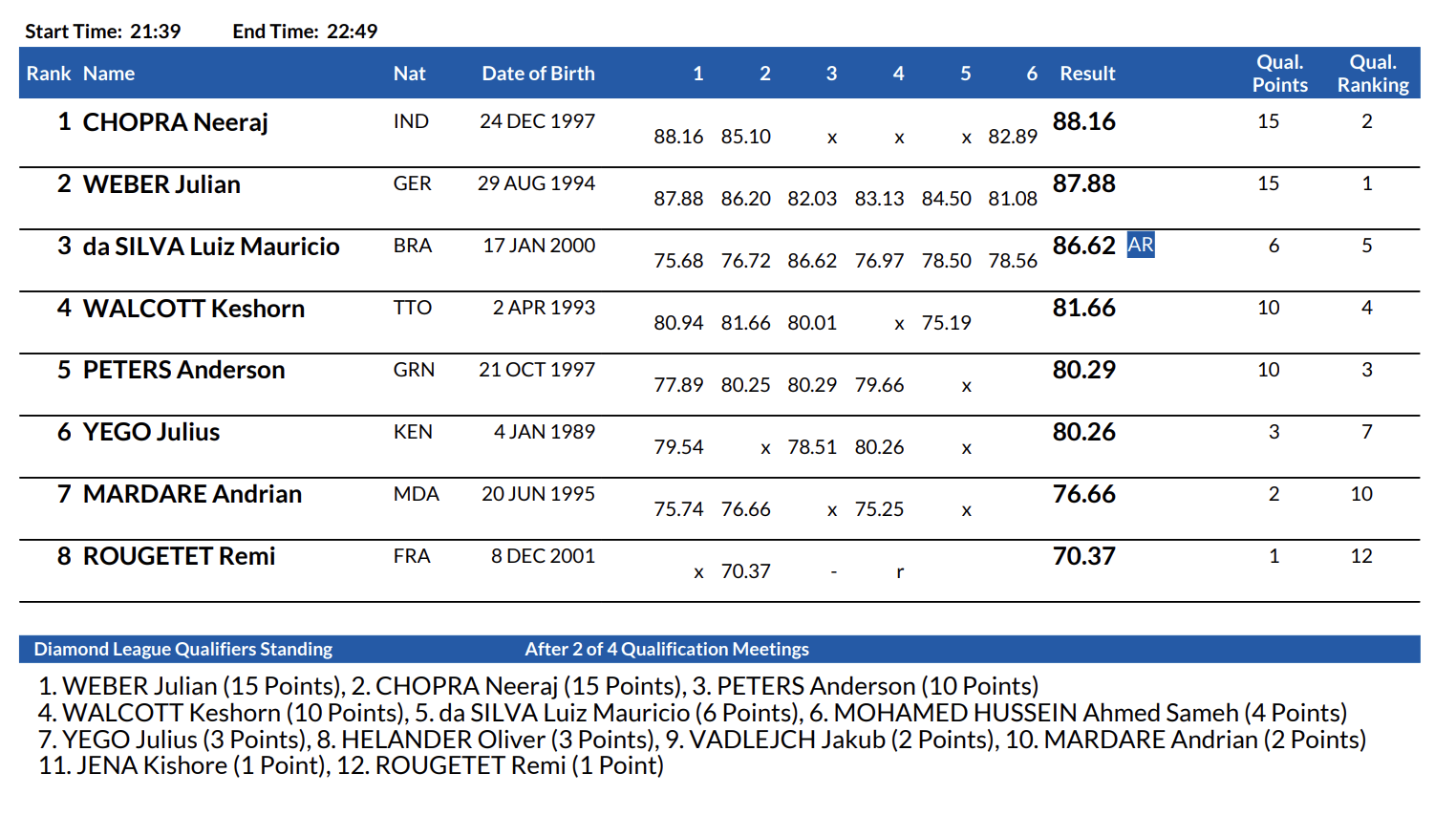 OFFICIAL: Final results of the night as Neeraj and Weber swap places from Doha. Which also means they are level on 15 points for the season's standings.