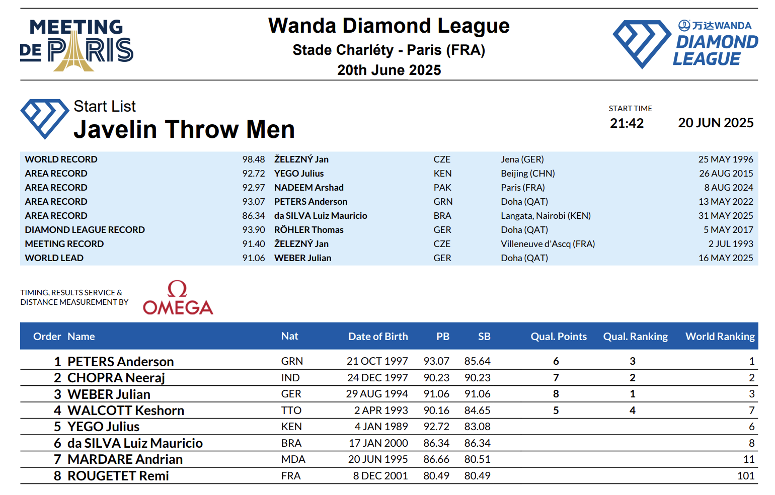 Over to javelin. The meet record of the Paris Diamond League is held by Neeraj's coach Jan Zelezny -- his throw of 91.40m in July 1993 still stands. The world lead this year is 91.06 by Julian Weber, and if Doha was anything to go by, Zelezny's record at Paris DL could be under threat tonight.