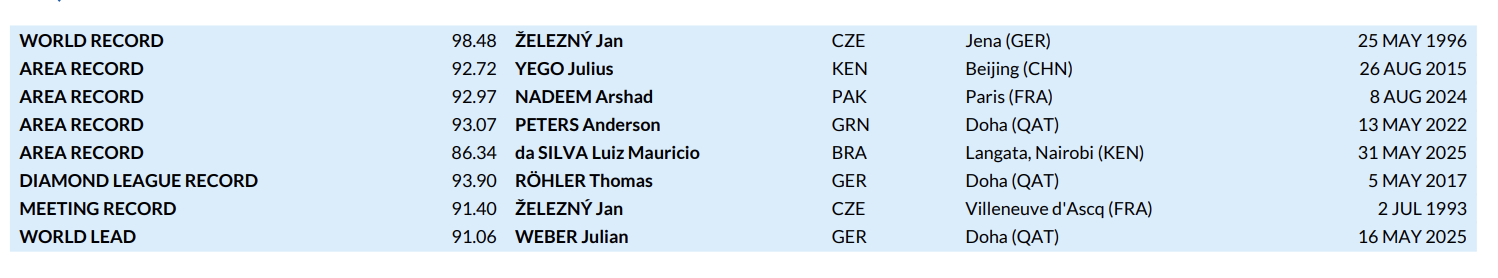 The world record in javelin seems to stand for a while longer at least with Jan Zelezny but Neeraj (and Weber) could have their eyes on the Paris DL meeting record of 91.40m. Also held by Zelezny.