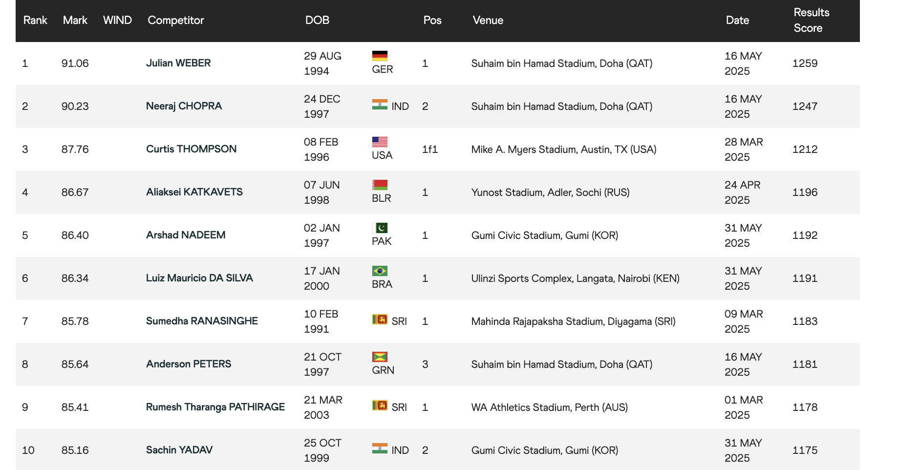 Here's a look at the season's top 10 throwers so far, with Weber and Neeraj leading the way with their 90m+ throws. Interestingly, Anderson Peters doesn't feature here but we know what he is capable of. Is tonight the night he makes a big splash? He will be the first to throw, followed by Neeraj.