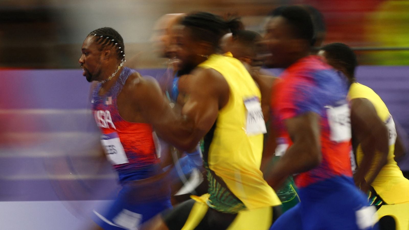 Paris 2024 Olympics - Athletics - Men's 100m Final - Stade de France, Saint-Denis, France - August 04, 2024. Noah Lyles of United States in action with athletes before winning the race. (REUTERS/Kai Pfaffenbach)