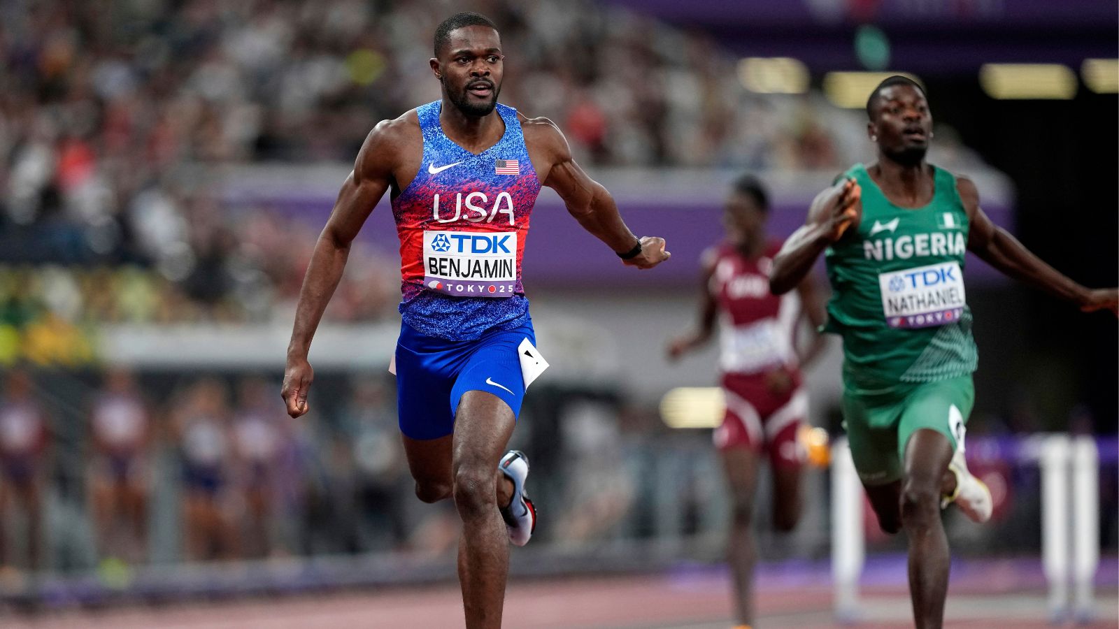Rai Benjamin of USA crossing the finish line of the men's 400m hurdles at the World Athletics Championships 2025. (AP Photo/Petr David Josek)