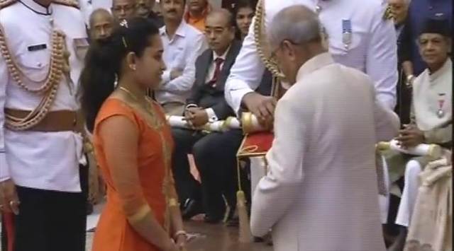 President Pranab Mukherjee on Thursday presented the Padma Shri awards at Rashtrapati Bhawan in New Delhi. Gymnast Dipa Karmakar, Wrestler Sakshi Malik, Discus Thrower Vikas Gowda and Paralympian Mariyappan Thangavelu were among the sportstars to be conferred with the award.